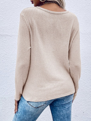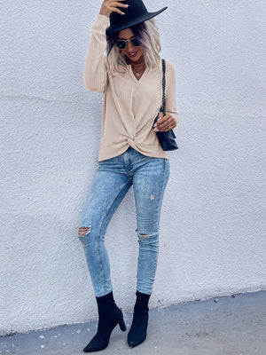 Beige V-Neck Solid Long Sleeves Cotton Top