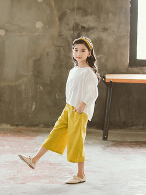 Beige & White Round Neck Long Sleeves Pure Cotton Palazzos & Top Solid Clothing Set