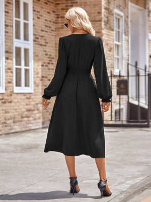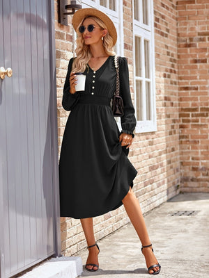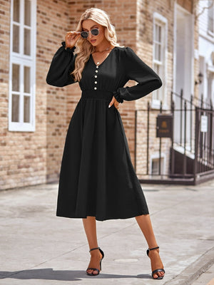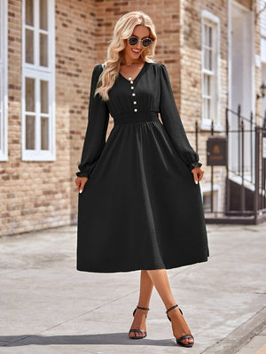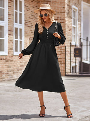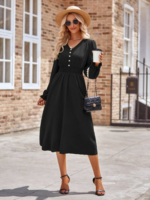 This elegant A-Line dress is made from high-quality black polyester, perfect for any occasion. The flattering silhouette and versatile color make it a must-have in any wardrobe. The dress features a classic v-neck neckline and a comfortable fit that will make you feel confident and stylish.