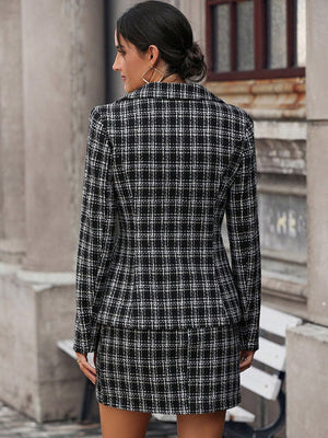 Black Checked Shirt Collar Long Sleeves Polyester Top