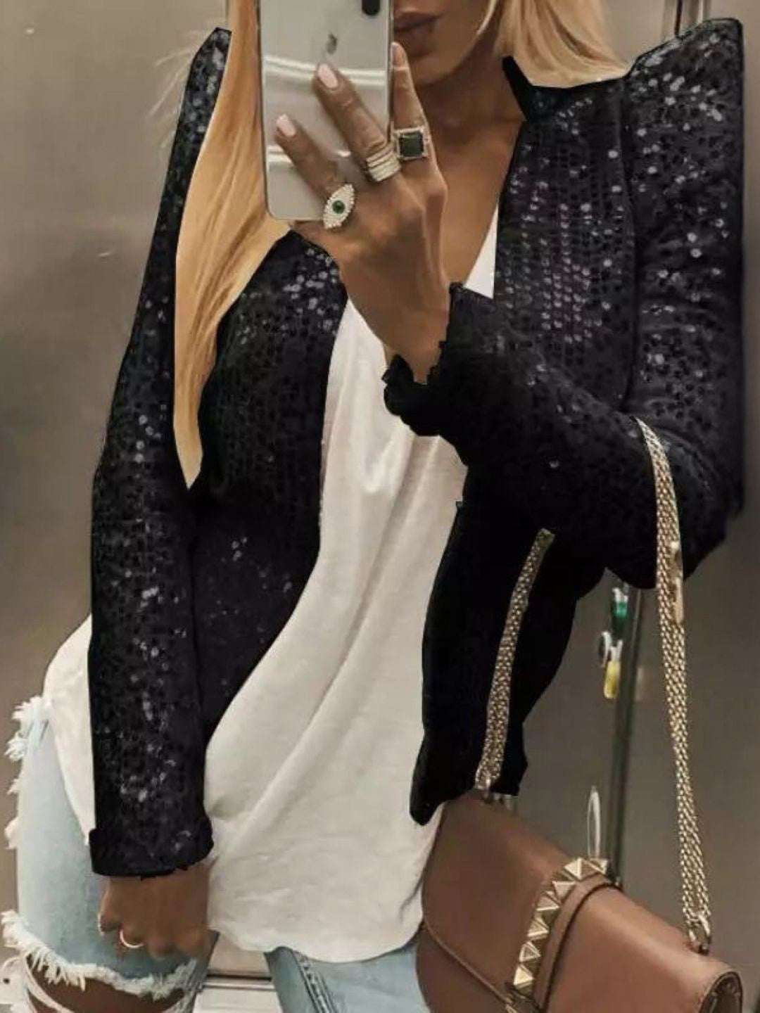 Black Collarless Long Sleeves Solid Polyester Open Front Jacket