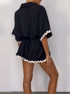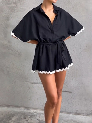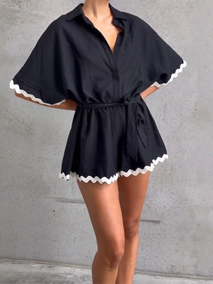 Elevate your casual wardrobe with the Black Contrast Trim Belted Romper ?a chic and modern one-piece designed for effortless style. This romper features a flowy silhouette with a collared neckline, button-down front, and wide kimono-style sleeves for added flair. The standout detail? A playful white wave-trim that lines the sleeves and hem, adding a stylish contrast to the sleek black fabric. The adjustable waist tie flatters your shape, making it perfect for dressing up or keeping it laid-back.