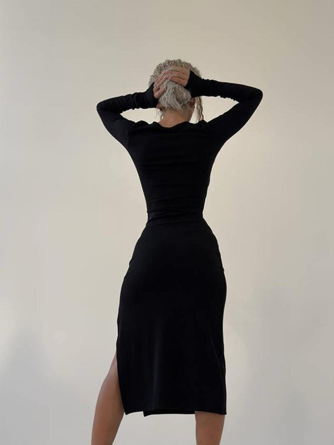 Dare to stand out in this sleek black long sleeve cut-out midi dress. Featuring a bold front cut-out detail, body-hugging fit, and a chic side slit, this dress perfectly blends sophistication with an edgy touch. Designed for nights out, cocktail events, or any occasion where you want to make a statement, this piece is both elegant and daring.