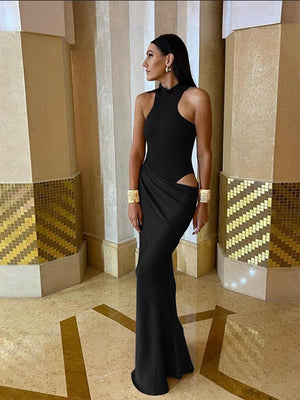 This stunning black evening gown features a sleek high-neck design with a bold side cut-out and a figure-hugging silhouette. Perfect for formal occasions, red carpet events, or an elegant night out, this gown combines sophistication with modern allure.