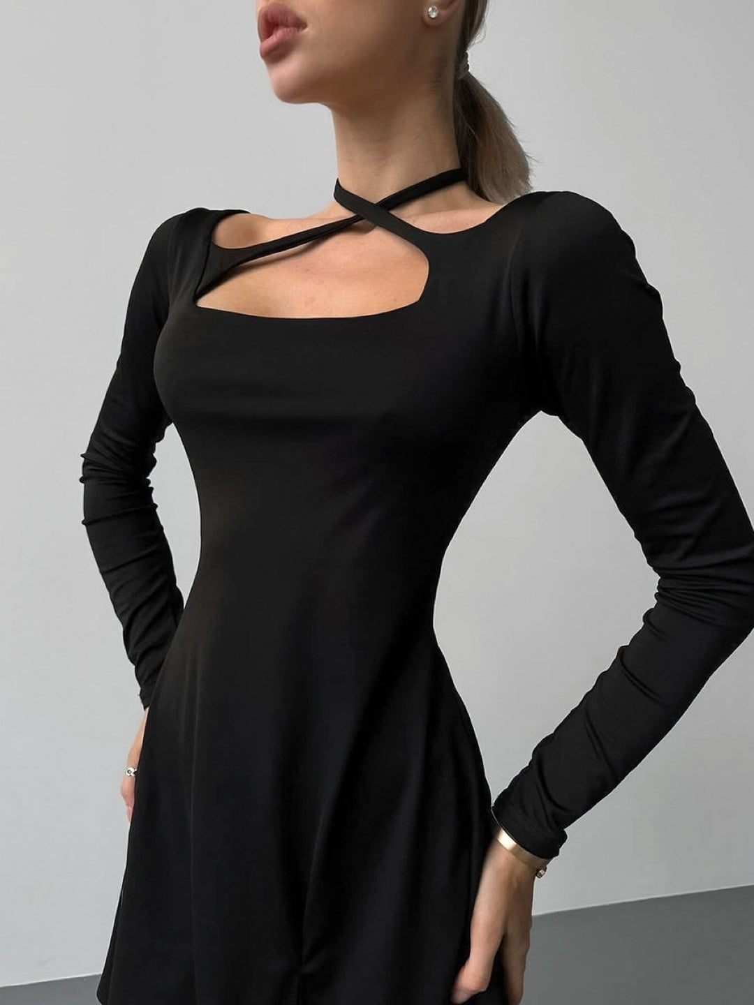 Turn heads in this sleek black cutout long sleeve mini dress. Featuring a modern square neckline with a chic crisscross strap detail, this dress strikes the perfect balance between edgy and elegant. The fitted bodice and slightly flared hem create a flattering silhouette that complements every figure.