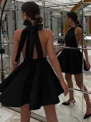 Step into timeless sophistication with this Black Halter Mini Dress ?the ultimate fusion of classic elegance and modern flair.Designed with a sleek halter neckline that beautifully frames the shoulders, this dress cinches at the waist and flares into a voluminous A-line skirt for a flattering, feminine silhouette. The highlight? A statement oversized bow at the back, adding a romantic and fashion-forward twist.