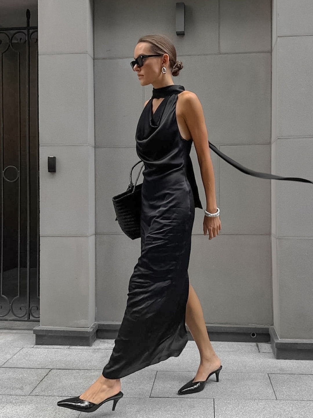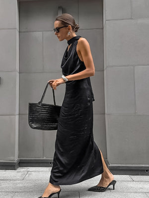 Elegant black halter neck midi dress with a draped neckline and sleek silhouette, perfect for evening events or classy night outs.