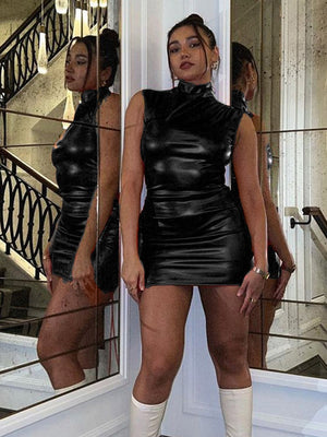 This elegant Black High Neck Bodycon Leather Dress is a must-have for any fashion-forward individual. The rich black color exudes sophistication, while the details adds a touch of allure.