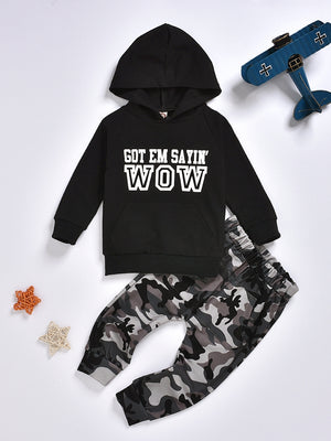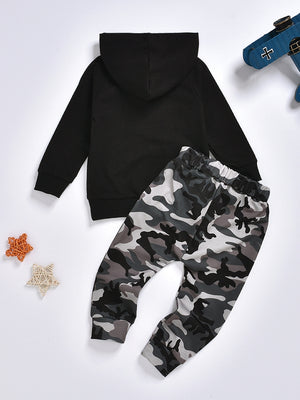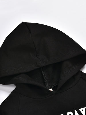 Black Hood Long Sleeves Polyester Printed Trousers Top Set
