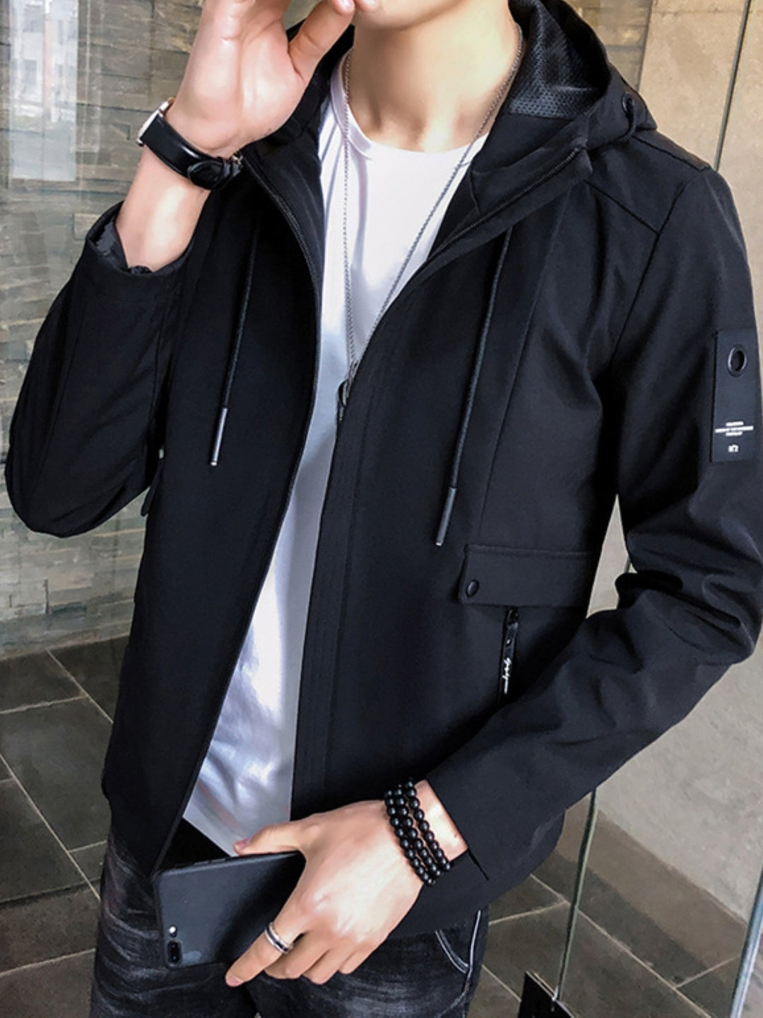 Black Hooded Long Sleeves Solid Polyester Open Front Jacket