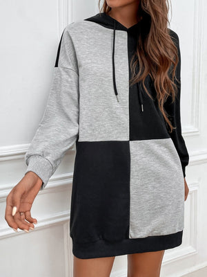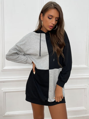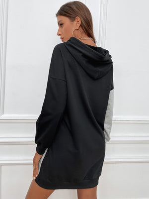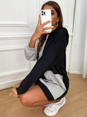 Black Hoodie Neck Colorblocked Long Sleeves Cotton Top