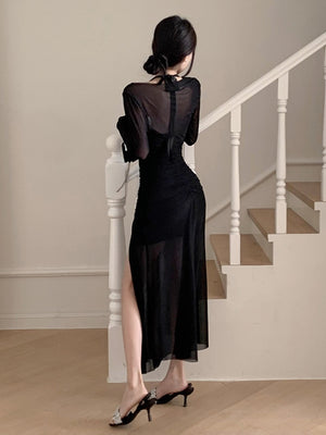 This Black Keyhole Neck Long Sleeves Solid Polyester Bodycon Side Slit Dress is ideal for any special event. The elegant design and bodycon fit highlight your curves, with the details adding a touch of allure. Crafted from high-quality polyester fabric, this dress is both comfortable and chic.