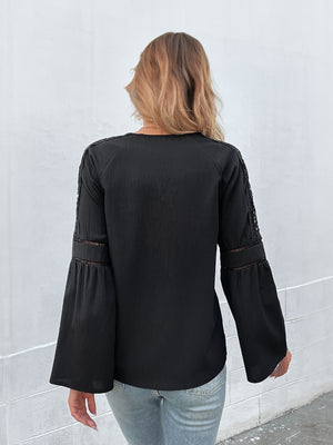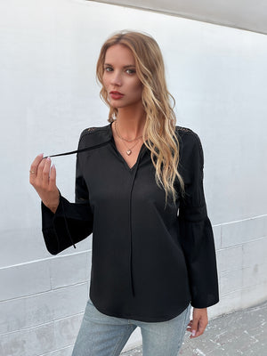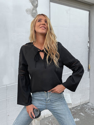 Black Keyhole Neck Solid Long Sleeves Polyester Top