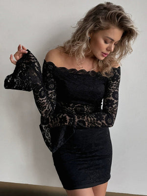Turn heads with this stunning black lace bodycon dress, designed to hug your curves and make a statement. Featuring elegant off-shoulder lace sleeves with flared cuffs, this dress is perfect for a night out, a cocktail party, or any special occasion where you want to stand out.