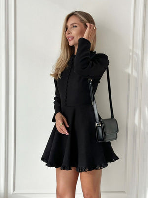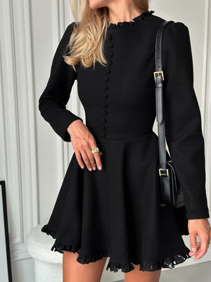 Turn heads with this Black Long Sleeve Elegant Mini Dress. Designed with a fitted bodice, chic button detailing, and a flared mini skirt, this dress offers the perfect balance of sophistication and charm. The long sleeves and structured silhouette make it ideal for evening events, parties, or date nights. Pair it with statement heels and a sleek bag for a polished, fashion-forward look.