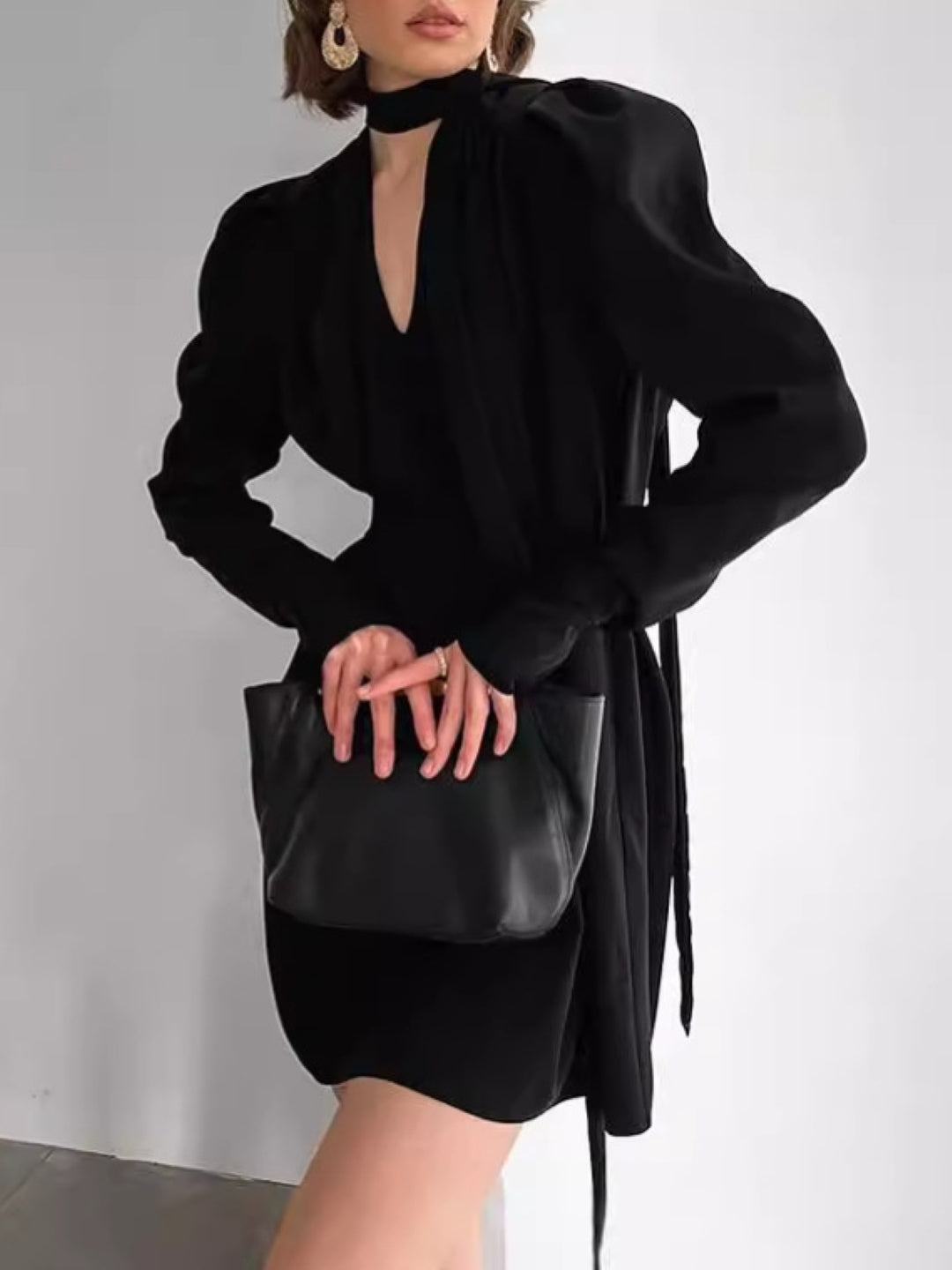 Make a statement in this elegant long sleeve mini dress, designed with puff shoulders and a sleek choker neckline for a bold, modern edge. Crafted in classic black, this dress is perfect for evening occasions, dinner parties, or a stylish night out. Pair with statement earrings and a clutch for an effortlessly chic look.