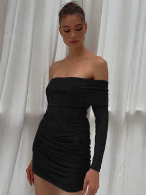 This elegant black above knee dress features a classic off-shoulder and long sleeves, making it a versatile and timeless addition to any wardrobe.