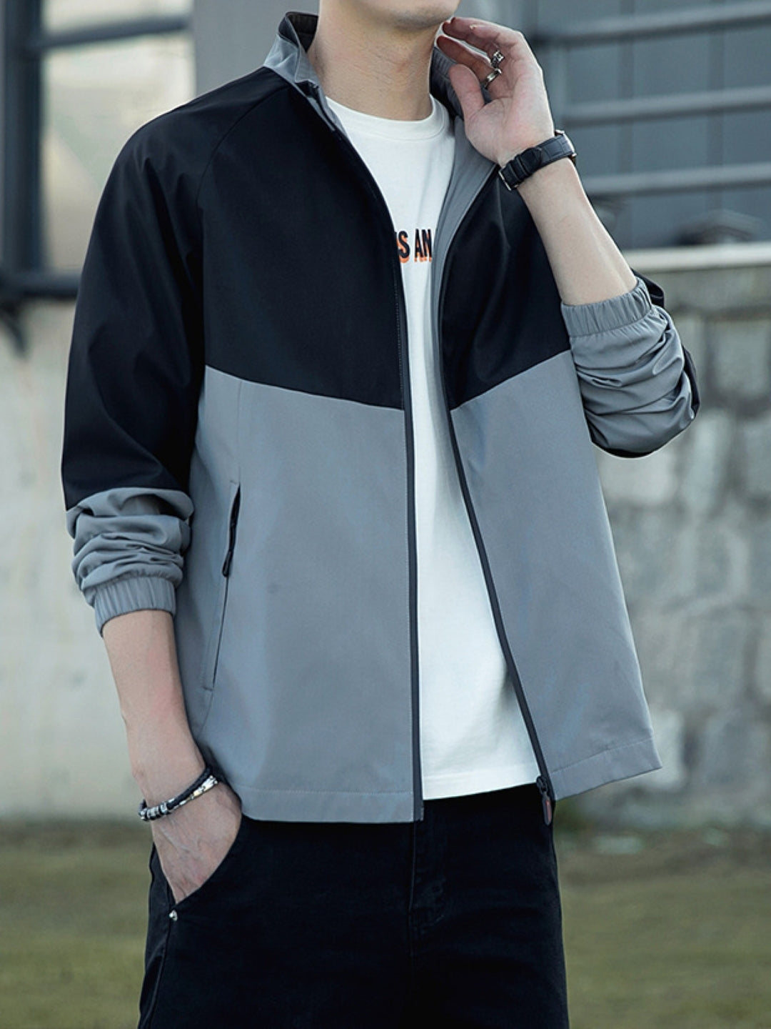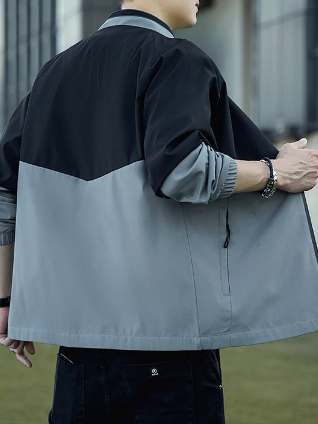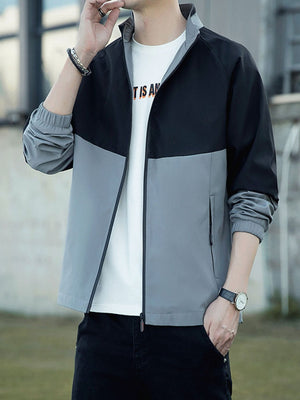 Black Mock Collar Long Sleeves Colourblocked Polyester Open Front Jacket