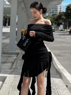 Pair it with your favorite heels and accessories to complete the look. Upgrade your wardrobe with this stunning black off-shoulder solid long sleeves above knee bodycon polyester dress.