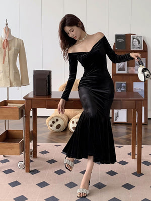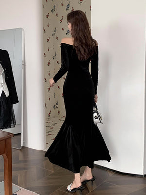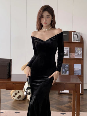 Black Off-Shoulder Solid Long Sleeves Maxi Bodycon Polyester Dress