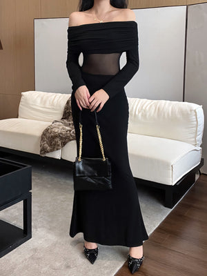 Black Off-Shoulder Solid Long Sleeves Maxi Bodycon Polyester Dress