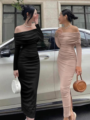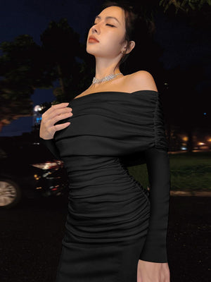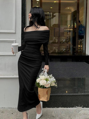 This elegant black maxi dress features a classic off-shoulder and long sleeves, making it a versatile and timeless addition to any wardrobe.