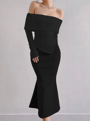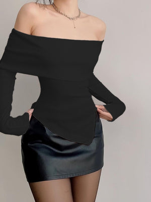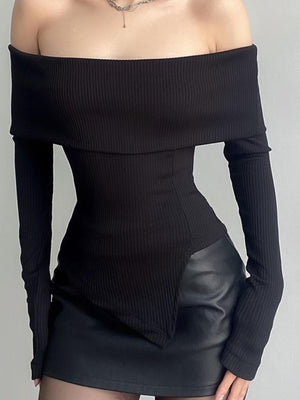 Black Off Shoulder Solid Long Sleeves Polyester Top