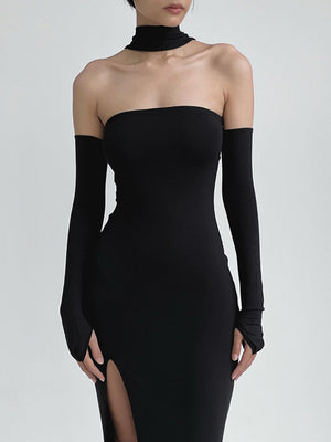 Black Off-Shoulder Solid Sleeveless Maxi Bodycon Polyester Dress