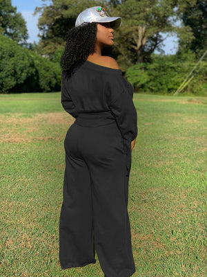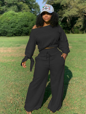 Black One Shoulder Polyester Long Sleeves Solid Top & Trousers Set