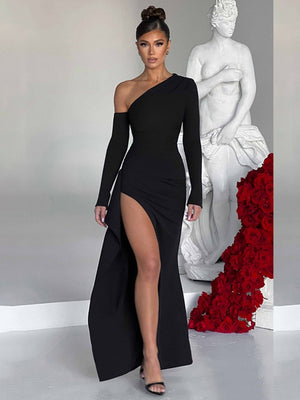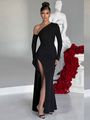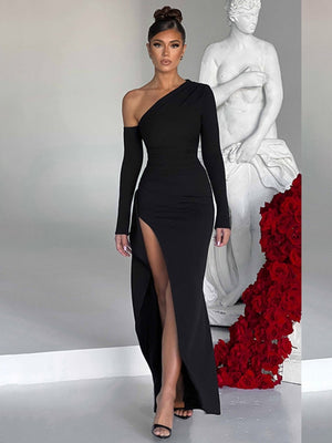 This Black One Shoulder Solid Bodycon Long Sleeves Polyester Dress is ideal for any special event. The elegant design and bodycon fit highlight your curves, with the details adding a touch of allure. Crafted from high-quality polyester fabric, this dress is both comfortable and chic.