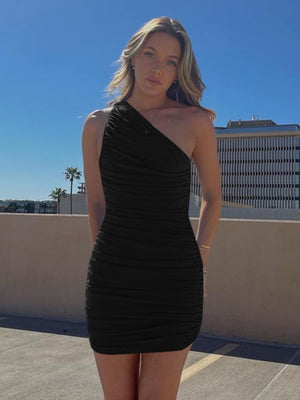 Black One Shoulder Solid Sleeveless Above Knees Bodycon Polyester Dress