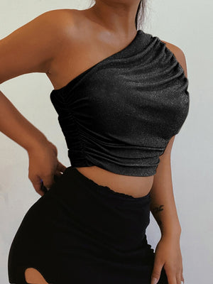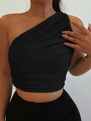 Introducing our Black One Shoulder Solid Sleeveless Polyester Casual Top, a stylish and versatile addition to your wardrobe. Made from high-quality polyester fabric, this top offers a comfortable and breathable fit. The one shoulder design adds a touch of elegance, while the black color provides a timeless and sophisticated look.