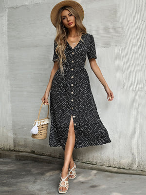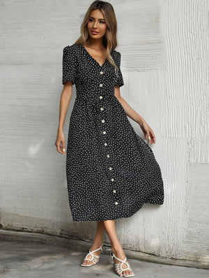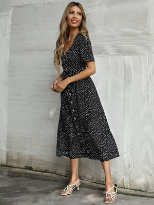 This elegant A-Line dress is made from high-quality black polyester, perfect for any occasion. The flattering silhouette and versatile color make it a must-have in any wardrobe. The dress features a classic v-neck neckline and a comfortable fit that will make you feel confident and stylish.