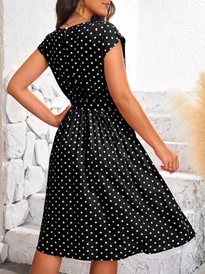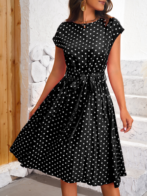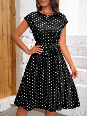 Black Round Neck A-Line Polka Dots Short Sleeves Knee Length Polyester Dress