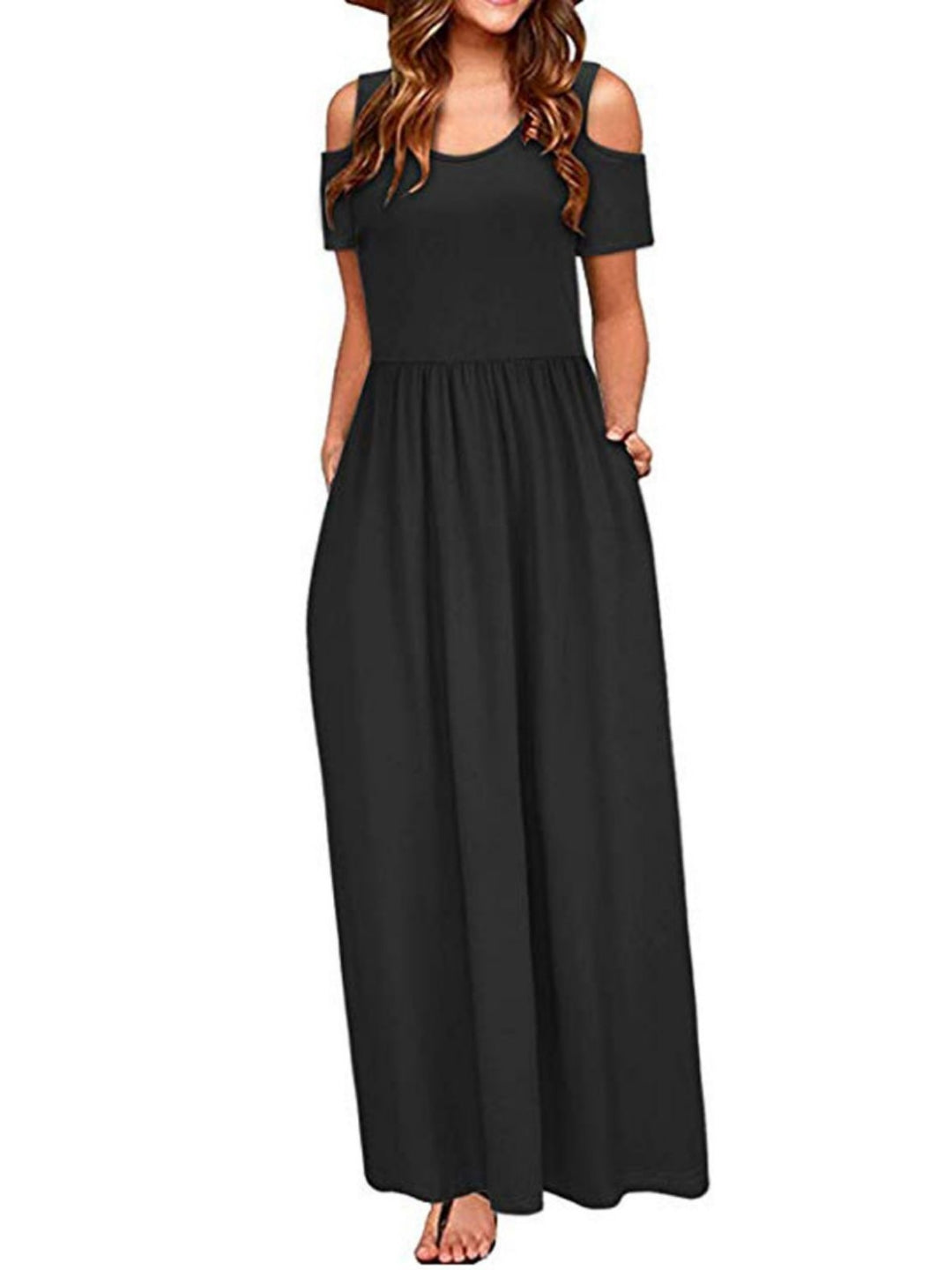 Black Round Neck A-Line Solid Short Sleeves Maxi Polyester Dress