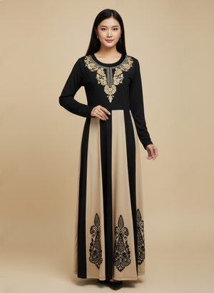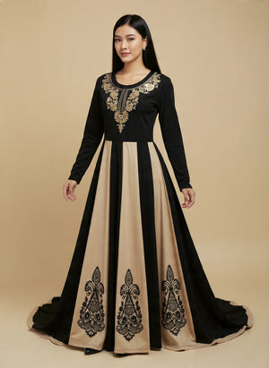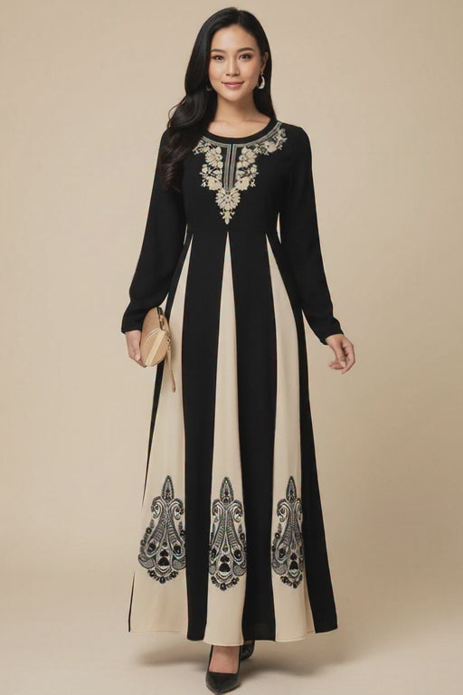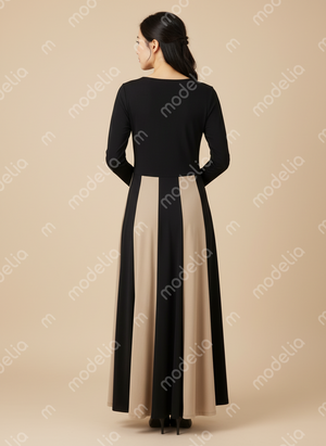 Black Round Neck Colourblocked Long Sleeves A-Line Polyester Maxi Dress