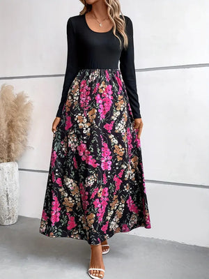 Black Round Neck Floral Long Sleeves A-Line Polyester Maxi Dress