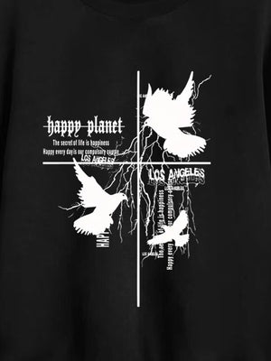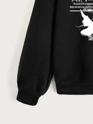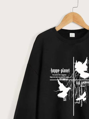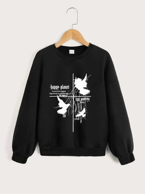 Black Round Neck Graphics Printed Long Sleeves Polyester Sweatshirt