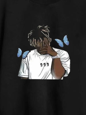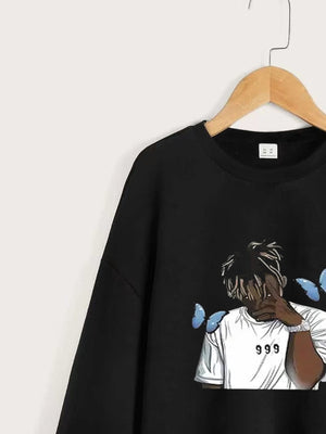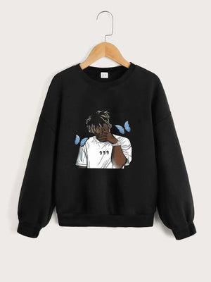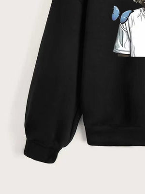 Black Round Neck Graphics Printed Long Sleeves Polyester Sweatshirt