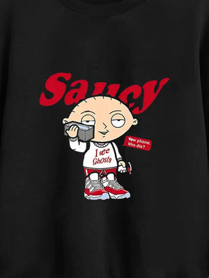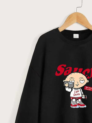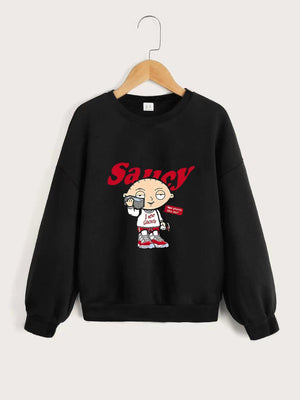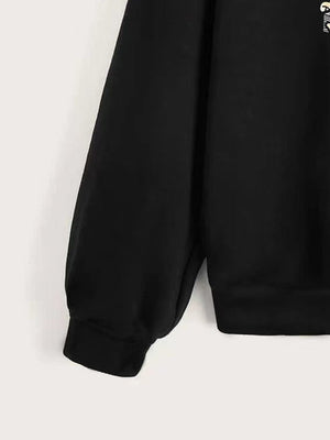 Black Round Neck Graphics Printed Long Sleeves Polyester Sweatshirt