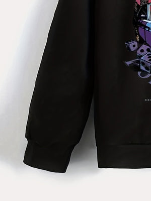 Black Round Neck Graphics Printed Long Sleeves Polyester Sweatshirt
