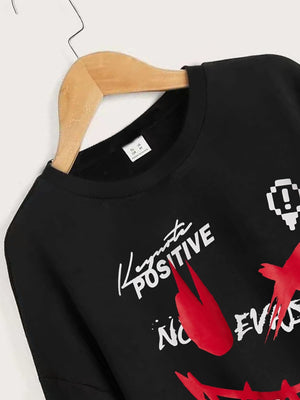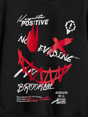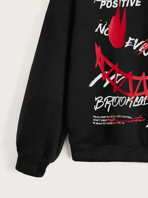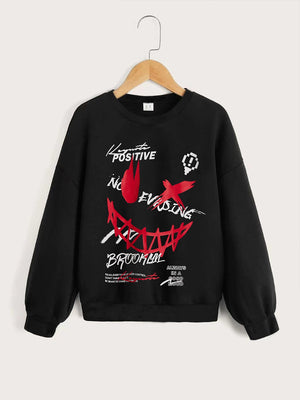 Black Round Neck Graphics Printed Long Sleeves Polyester Sweatshirt