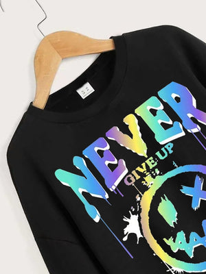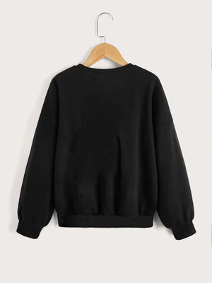 Black Round Neck Graphics Printed Long Sleeves Polyester Sweatshirt