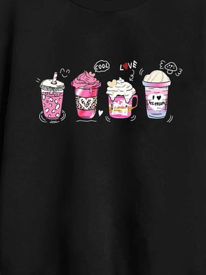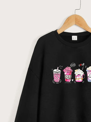 Black Round Neck Graphics Printed Long Sleeves Polyester Sweatshirt
