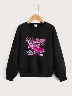 Black Round Neck Graphics Printed Long Sleeves Polyester Sweatshirt