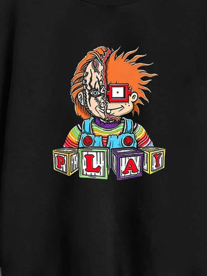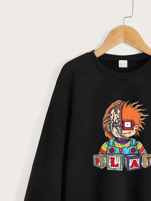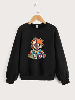 Black Round Neck Graphics Printed Long Sleeves Polyester Sweatshirt