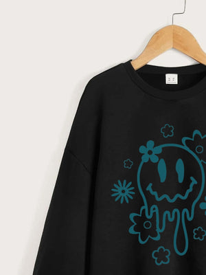 Black Round Neck Graphics Printed Long Sleeves Polyester Sweatshirt