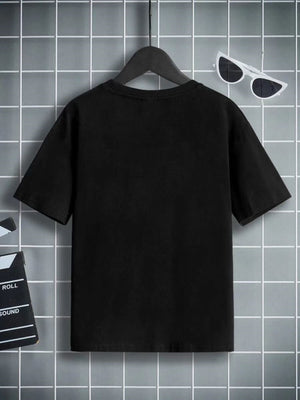 Make a bold impression with this black round neck T-shirt showcasing striking graphic prints. The soft polyester material ensures a comfortable and stylish fit for any casual occasion.