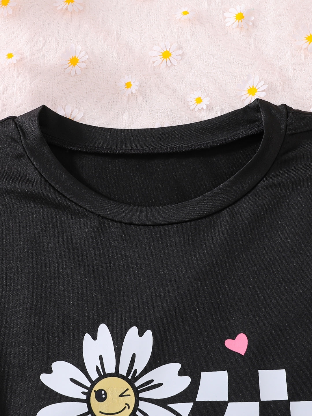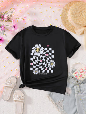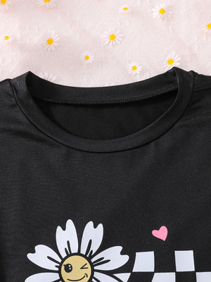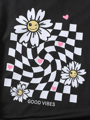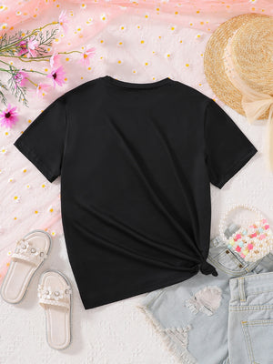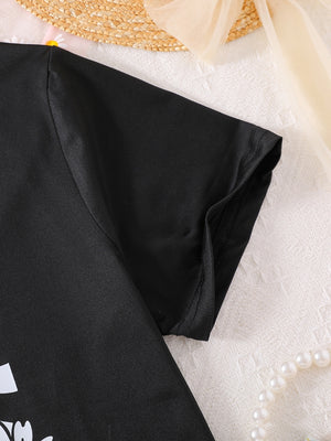 Black Round Neck Graphics Printed Short Sleeves Polyester T-Shirt