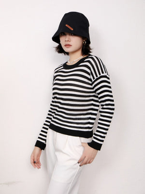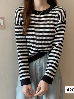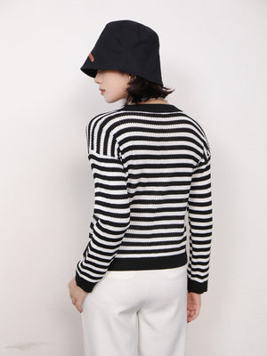 Black Round Neck Long Sleeves Horizontal Stripes Top